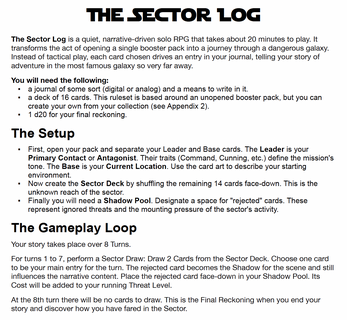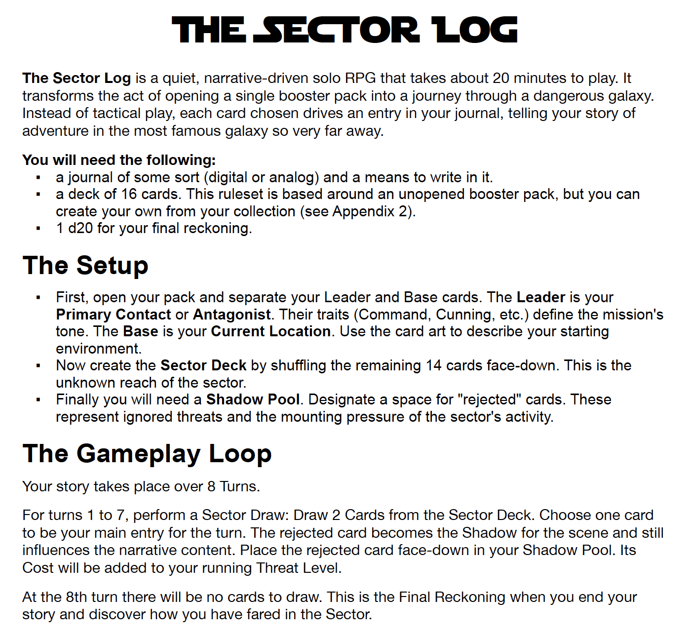 The Sector Log is a short solo journaling RPG where opening a booster pack becomes a story.